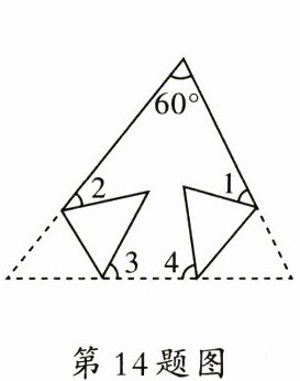 14.240° 解析:已知一个角为60°,三角形另两个角和为120°,根据翻折性质∠1 + ∠2 + ∠3 + ∠4 = 2(180° - 60°) = 240°.