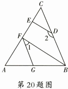 20. (7分)如图,在$\triangle ABC$中,$\angle AGF = \angle ABC$,$\angle 1 + \angle 2 = 180^{\circ}$.