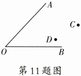 11.解:连接CD,作CD的垂直平分线,作$\angle AOB$的角平分线,两线交于点P,此时点P为所求灯柱位置,如图所示:
