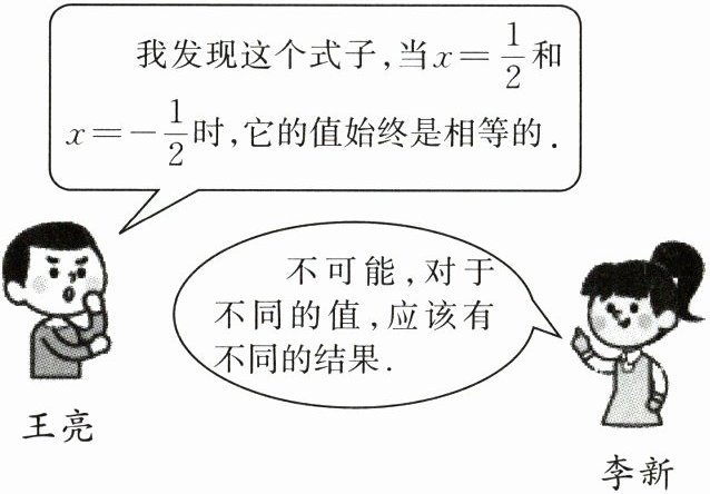 13.(8分)张老师在黑板上布置了一道题。计算$2(x + 1)^2 - (4x - 5)$,求当$x = \frac{1}{2}$和$x = -\frac{1}{2}$时的值。王亮和李新展开了下面的讨论,你认为他们两人谁说的对?并说明理由。