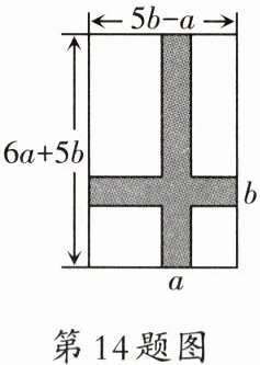 14.(8分)为了提高业主的宜居环境,某小区物业公司准备在一个长为$(6a + 5b)$米,宽为$(5b - a)$米的长方形草坪上修建一横一竖互相垂直且宽度均为$a$米的通道。