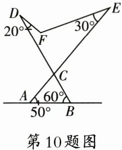 10. 如图是可调节躺椅示意图(数据如图),$AE$与$BD$的交点为$C$,且$∠A$,$∠B$,$∠E$,保持不变。为了舒适,需调整$∠D$的大小,使$∠EFD = 115^{\circ}$,则图中$∠D$应_(填“增加”或“减少”)_$^{\circ}$。