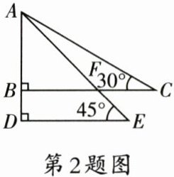 2. 两个直角三角形如图放置,则$∠BFE$与$∠CAF$的度数之和等于(
