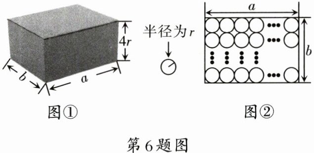 6. 如图①,某品牌饮料的包装箱是一个长、宽、高分别为$a$,$b$,$4r$的长方体纸箱,饮料瓶可近似看成底面半径为$r$,高为$4r$的圆柱体。如图②,若纸箱里装满了一层饮料,那么纸箱的空间利用率(听装饮料总体积与纸箱体积的比)为(