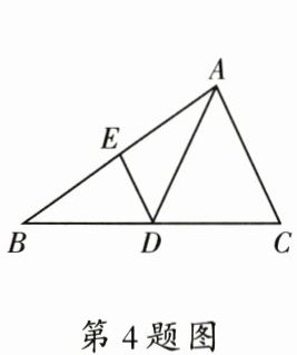 4. 如图, 在 $ \triangle ABC $ 中, 点 $ D,E $ 分别是边 $ BC,AB $ 的中点, 连接 $ AD,DE $. 若 $ \triangle ABC $ 的面积是 8, 则 $ \triangle BDE $ 的面积是