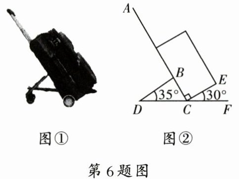 6. 如图①是某种型号拉杆箱的实物图, 图②是它的示意图. 行李箱的侧面可看成一个矩形, 点 $ F,C,D $ 在同一条直线上. 为了拉箱时的舒适度, 现将 $ \angle ABD $ 调整为 $ 75^{\circ} $, 若 $ \angle D $ 保持不变, 则图中 $ \angle ECF $ 应