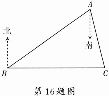 16. (8 分) 如图, $ B $ 处在 $ A $ 处的南偏西 $ 60^{\circ} $ 方向, $ C $ 处在 $ A $ 处的南偏东 $ 15^{\circ} $ 方向, $ C $ 处在 $ B $ 处的正东方向, 求 $ \angle ACB $ 的度数.