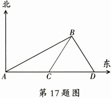 17. (8分)如图,某巡逻船上午11时30分在$A$处巡逻,观测到岛礁$B$在北偏东$60^{\circ}$的方向,该船以每小时10海里的速度向正东方向航行到$C$处,观测岛礁$B$在北偏东$30^{\circ}$,继续以相同速度向正东方向航行到$D$处时,再观测到岛礁$B$在北偏西$30^{\circ}$。当巡逻船到达$C$处时,恰与岛礁$B$相距20海里,请你分别确定该巡逻船从$A$处到达$C$处和$D$处所用的时间。