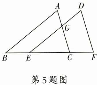 5. 如图,将$\triangle ABC$沿着射线$BC$方向平移后得到$\triangle DEF$,点$B$的对应点$E$在$BC$边上,且$EC=2BE$,$AC$,$DE$交于点$G$,若$EF=9$,则$\triangle ABC$平移的距离是(