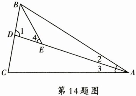 14. 如图,在$\triangle ABC$中,$\angle 1 = 100^{\circ}$,$\angle C = 80^{\circ}$,$\angle 2 = \frac{1}{2}\angle 3$,$BE$平分$\angle ABC$,则$\angle 4 =$