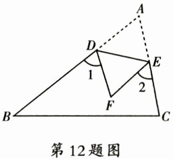 12. 如图,将纸片$\triangle ABC$沿$DE$折叠,使点$A$落在点$F$处,已知$\angle 1 + \angle 2 = 100^{\circ}$,则$\angle A =$