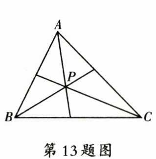 13. 如图,点$P$是$\triangle ABC$的三个内角平分线的交点,若$\triangle ABC$的周长为24 cm,面积为36 cm²,则点$P$到边$BC$的距离是