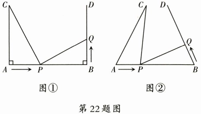 22. (10分)如图①,$AB = 4\ cm$,$AC\perp AB$,$BD\perp AB$,$AC = BD = 3\ cm$.点$P$在线段$AB$上以$1\ cm/s$的速度由点$A$向点$B$运动,同时,点$Q$在线段$BD$上由点$B$向点$D$运动.它们运动的时间为$t$(单位:s).