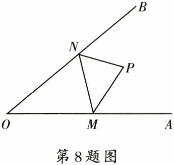 8. 如图,点P是∠AOB内任意一点,且∠AOB=50°,点M和点N分别是射线OA和射线OB上的动点,当△PMN周长取最小值时,则∠MPN的度数为