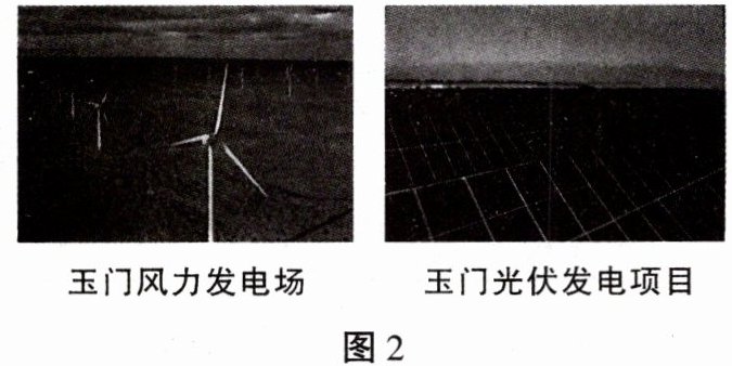 化工产业始终是玉门的主导产业。除此之外,玉门还利用丰富的风能、太阳能资源大力发展风电、光电产业(图 2),享有“陆上三峡”之称。玉门新、老城区培育形成了以新能源及装备制造为主的玉门工业园、以石油化工产业为主的老市区化工工业园,推动形成各具特色、优势互补、结构合理的产业集群协调发展格局。