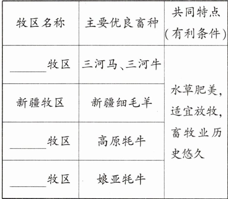畜牧业两类。9. 我国四大牧区的主要优良畜种及共同特点:结合教科书相关内容,填写表4-1-2。