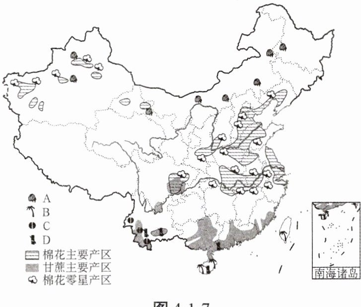等特点。2. 图4-1-7示意中国部分经济作物分布,写出图中图例代表的经济作物名称。