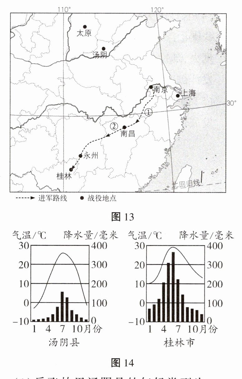 23. 【新考法·素材跨历史】某电视节目走进河南安阳汤阴岳飞故里,感受岳飞“尽忠报国,还我河山”的跌宕传奇一生,体悟“文臣不爱钱,武臣不惜命”的凌云壮志。小明同学调查了岳飞的生平,并在地图上绘制了公元1130—1132年岳飞征战的线路示意简图(图13)和汤阴县、桂林市气温曲线和降水量柱状图(图14)。阅读图文材料,完成下列问题。(12分)