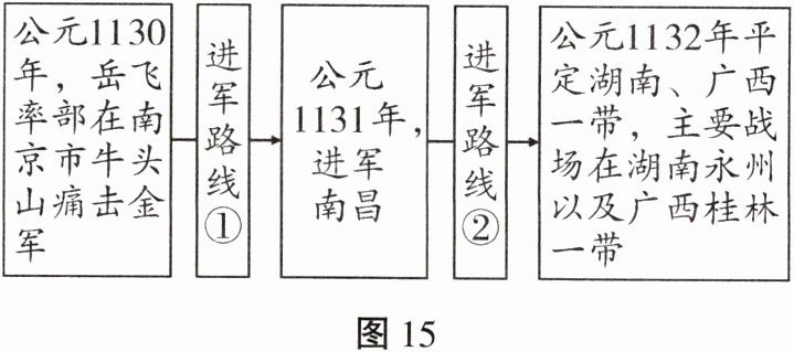 (2)读图13和图15,公元1130年至公元1132年,岳飞率军一路南下,进军线路①抵达的南昌市所在省级行政区的简称为