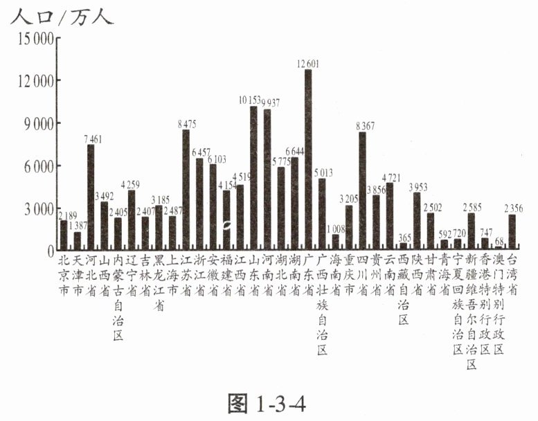 【新考法·素材跨数学】西安某学校地理社团探究中国各省级行政区的人口数量,搜集数据(2020 年)后绘制成图 1 - 3 - 4。读图完成 6、7 题。