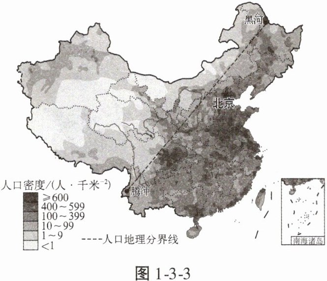 (2025·西安期末)中国地理学家胡焕庸提出了我国人口地理分界线,总结出我国人口分布规律,其所揭示的人口分布格局,至今仍具现实意义。读中国人口分布和人口地理分界线位置示意图(图 1 - 3 - 3),完成 2、3 题。