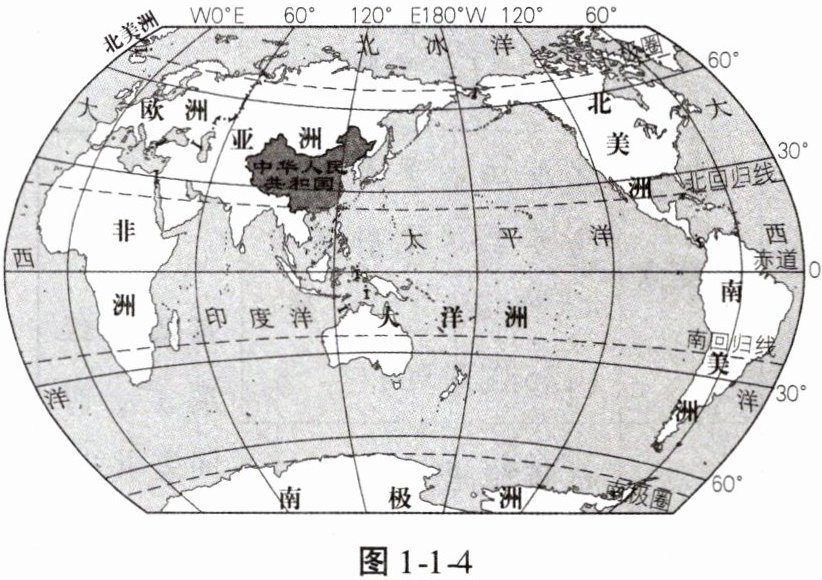 读中国在世界上的位置图(图 1-1-4),完成 1—3 题。