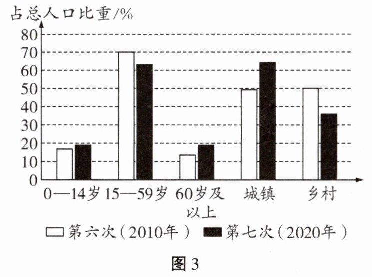 【新考法·素材跨数学】读中国第六、七次人口普查部分数据对比图(图 3),完成 1—3 题。