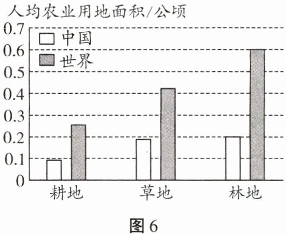 “民非谷不食,谷非地不生。”耕地是粮食生产的命根子,是中华民族永续发展的根基。图6为2019年中国人均农业用地面积与世界人均农业用地面积比较图。据此完成11、12题。