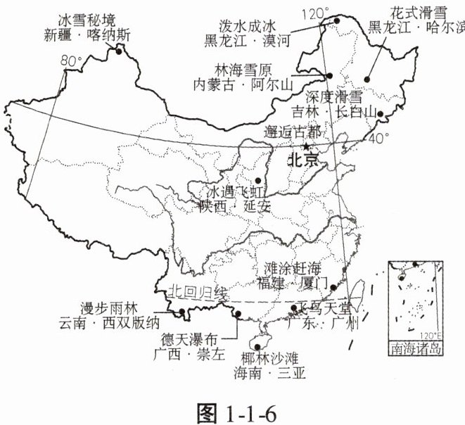 2024 年春节假期,“南北互换”式旅游广受青睐,不少人选择和家人一起去领略不同的自然与人文风光。读中国春节期间“南北互换”式旅游热门景点示意图(图 1-1-6),完成 7—9 题。