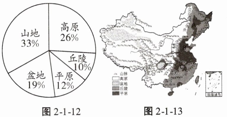 10. 我国地域辽阔,从“连接天地”的世界第三极——青藏高原到与海平面接壤的沿海平原,从富饶的“天府之国”到富裕的“鱼米之乡”,处处彰显神州风采。读中国陆地地形类型构成图(图 2 - 1 - 12)和中国地形的分布图(图 2 - 1 - 13),完成下列问题。