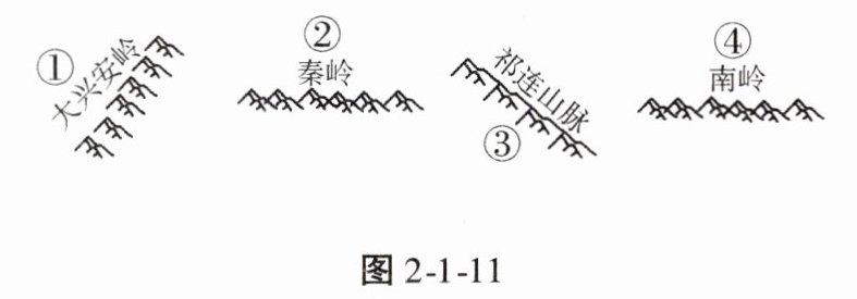 9. 我国的许多山脉是重要的地理分界线,如省级行政区分界线、地形区分界线等。读我国部分山脉图(图 2 - 1 - 11),图中数码代表山脉两侧的地形区,下列叙述正确的是(