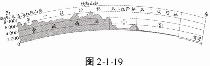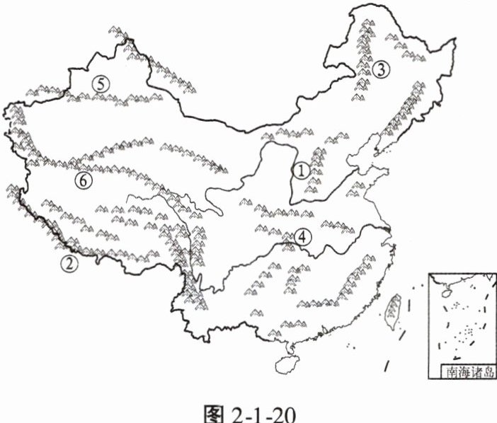 8. (2025·咸阳期末) 我国地形类型复杂多样,纵横交错的山脉构成我国地形的骨架。我国地势特征明显,不仅塑造了丰富多彩的自然景观,也对我国其他方面产生了深远的影响。读中国主要山脉分布图(图 2 - 1 - 20)和中国地势三级阶梯分布示意图(图 2 - 1 - 21),完成下列问题。