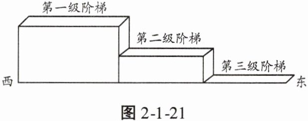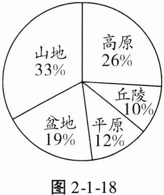 图 2 - 1 - 17 为中国地势三级阶梯分布示意图,图 2 - 1 - 18 为中国陆地地形类型构成图。读图,完成 4、5 题。