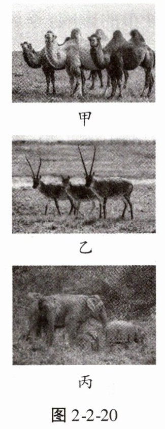 探究资料二:复杂多样的气候条件,有利于多种生物的生长繁殖,使我国的动植物资源比较丰富。图2-2-20中甲所示为野骆驼,在我国主要分布于西北荒漠;乙所示为藏羚羊,分布于青藏高原;丙所示为亚洲象,在我国主要分布于云南省南部西双版纳一带。