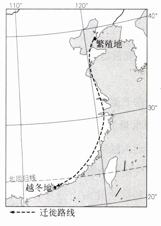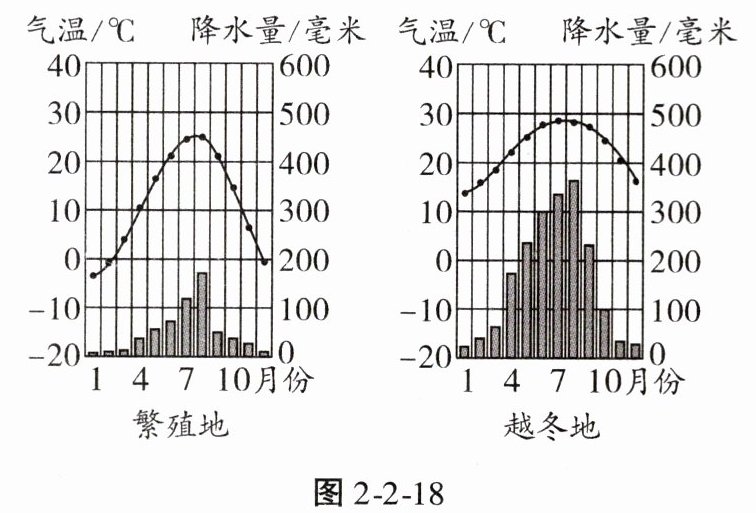 每年10月前后,黑脸琵鹭从辽宁出发,一路南下到深圳过冬,其越冬地深圳的生态环境优越、食物资源丰富。图2-2-17为黑脸琵鹭迁徙路线图,图2-2-18为黑脸琵鹭繁殖地和越冬地气候资料图。据此完成11、12题。