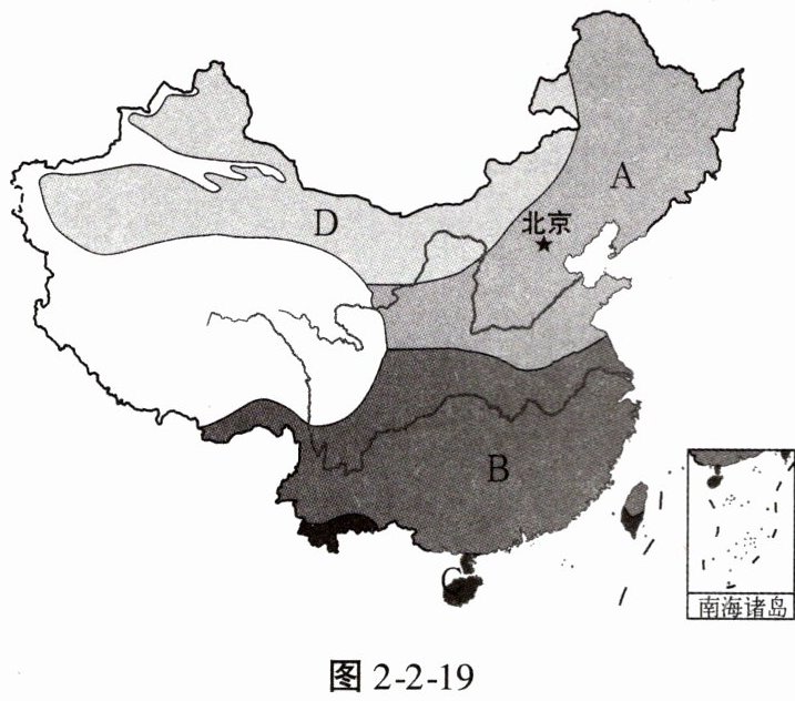 探究资料一:我国地域辽阔,地跨众多的温度带和干湿地区,使气候具有复杂多样的特点。此外,由于地形多样、地势高低悬殊,更增加了气候的复杂多样性。图2-2-19为中国主要气候类型分布图。