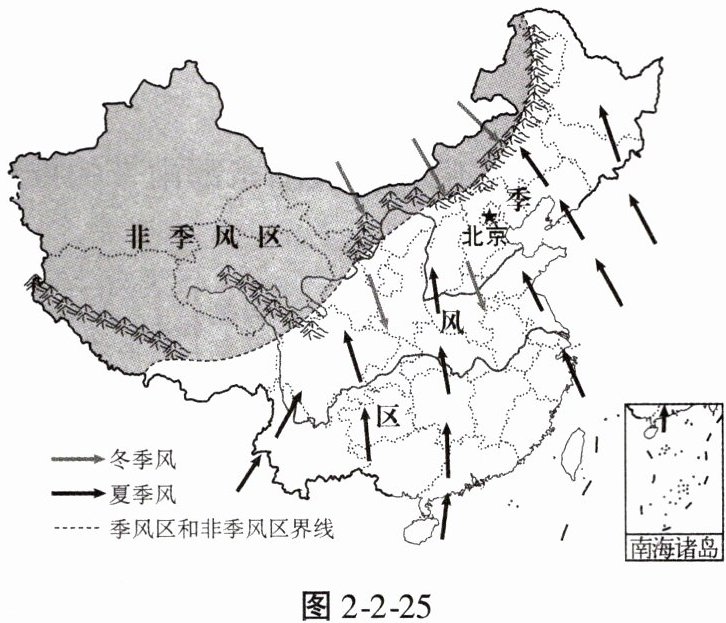 我国是世界上季风气候比较典型的地区之一。读中国季风区与非季风区分布图(图2-2-25),完成2、3题。