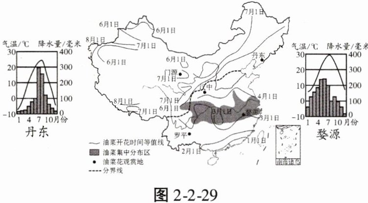 资料二:中国油菜花开花日期分布图、辽宁丹东和江西婺源的气温曲线和降水量柱状图(图2-2-29)。