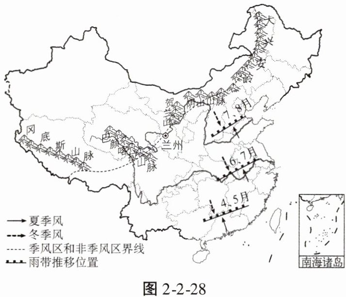 【新考法·素材跨语文】清明节是我国传统的节日,大概在每年的4月4日至6日之间。唐朝诗人杜牧还留下了“清明时节雨纷纷,路上行人欲断魂”的名句。读中国雨带移动示意图(图2-2-28),完成9、10题。