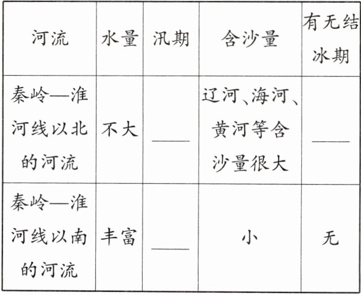 (2) 秦岭—淮河线以北、以南河流的水文特征:结合教科书相关内容,填写表2-3-3。