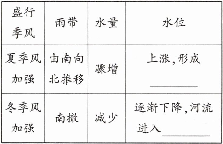 (1) 水文特征及成因:结合教科书相关内容,填写表2-3-2。
