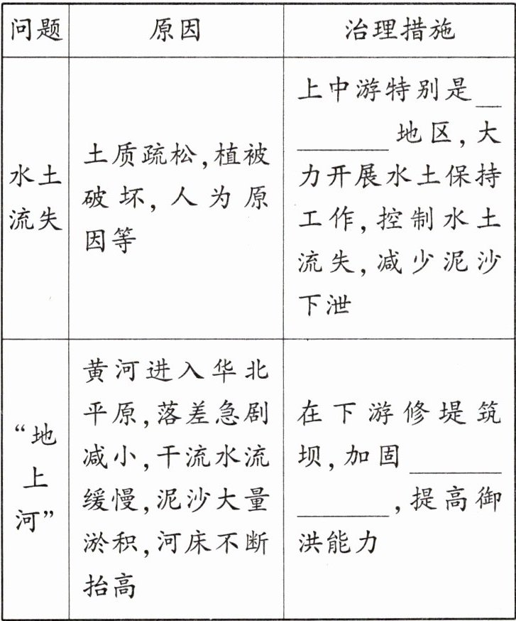 4. 黄河的问题及治理:结合教科书相关内容,填写表2-3-10。