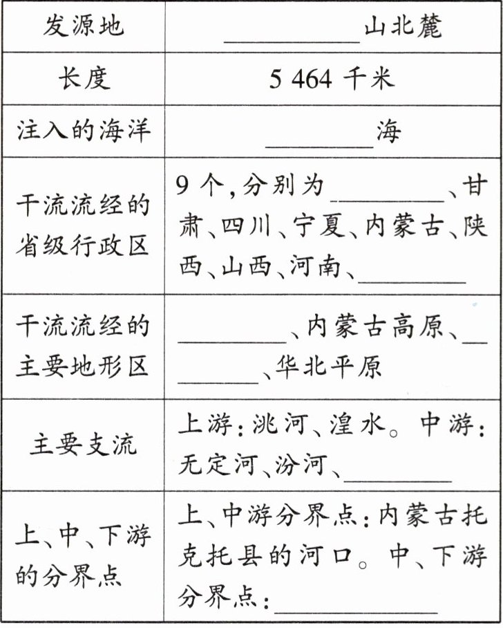 1. 黄河概况:结合教科书相关内容,填写表2-3-8。