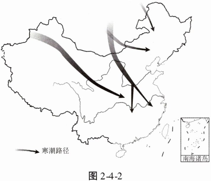 寒潮是冬半年影响我国的主要灾害性天气。读图2-4-2,完成6、7题。