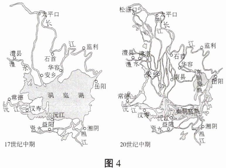 洞庭湖是长江中游地区的著名湖泊,湖广熟,天下足。洞庭湖区是我国传统农业的发祥地,也是最大的水稻种植区和重要商品粮基地,在保障国家粮食安全方面发挥着不可替代的作用。图4为不同时期洞庭湖周边地区图。读图,完成1—3题。