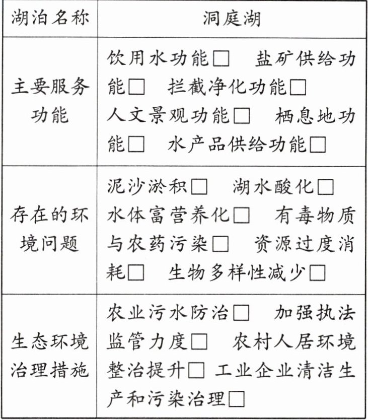 (4) 结合调查表,探究洞庭湖生态环境治理的具体措施。