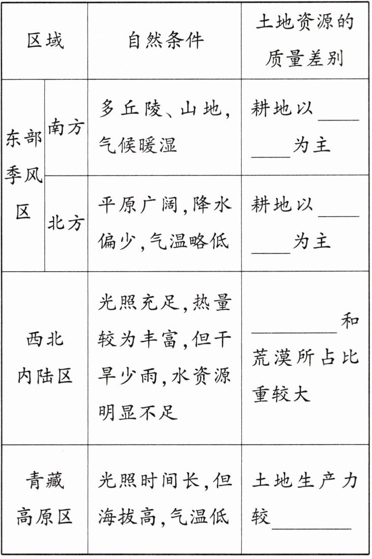 1. 不同区域的自然条件、土地资源的质量差别:结合教科书相关内容,填写表 3 - 1 - 3。