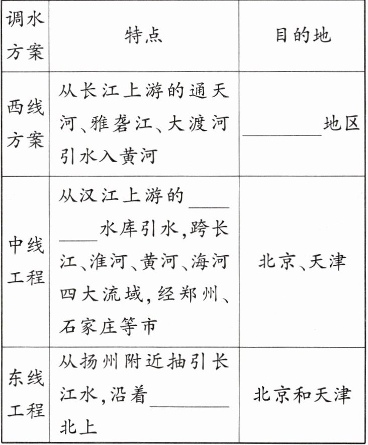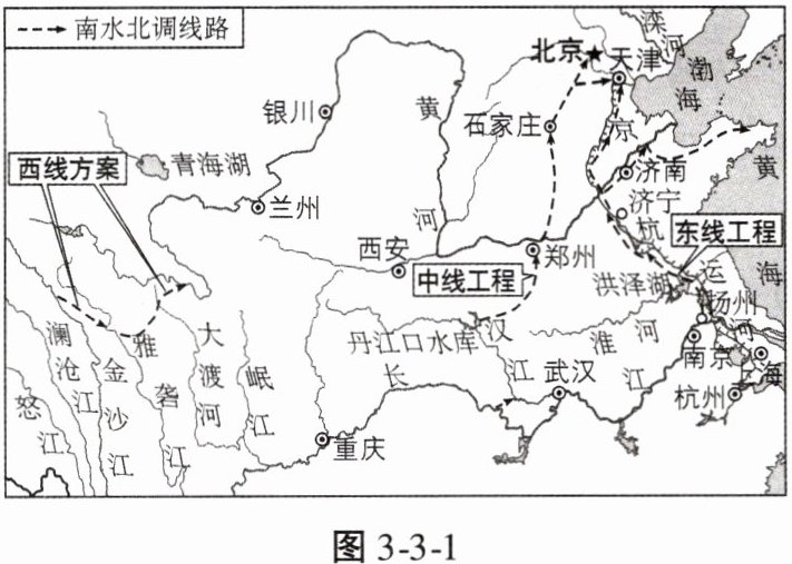 、西北地区。(2) 读南水北调线路示意图(图 3 - 3 - 1),结合教科书相关内容,填写表 3 - 3 - 2。