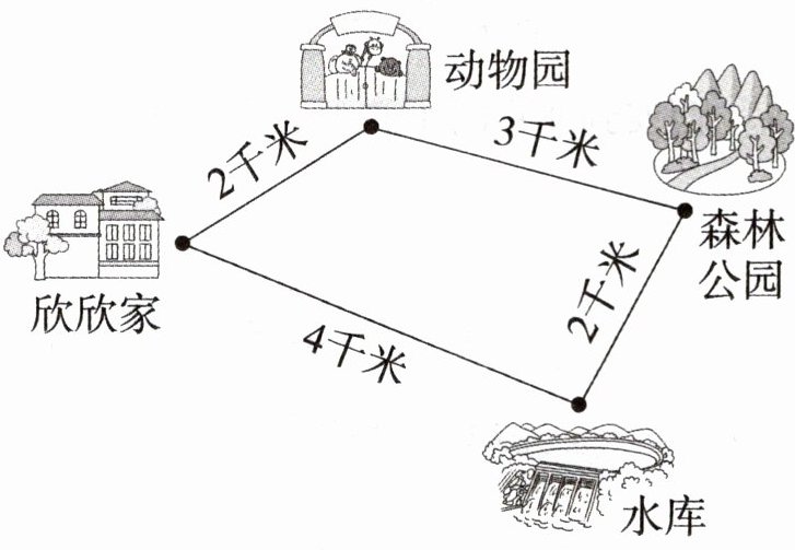 3. 欣欣和爸爸徒步去森林公园,走哪条路近?近多少千米?