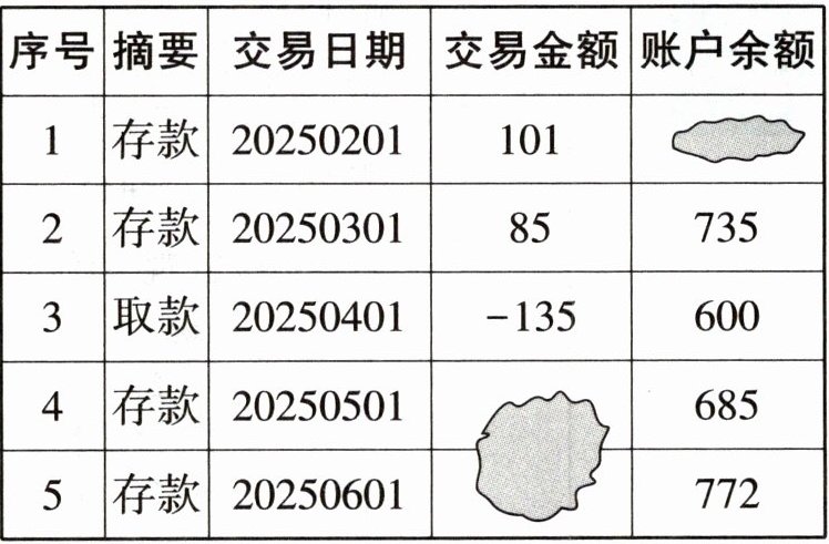 (4) 乐乐把每个月的零花钱都存了起来,下面是她银行卡账单中的部分信息。